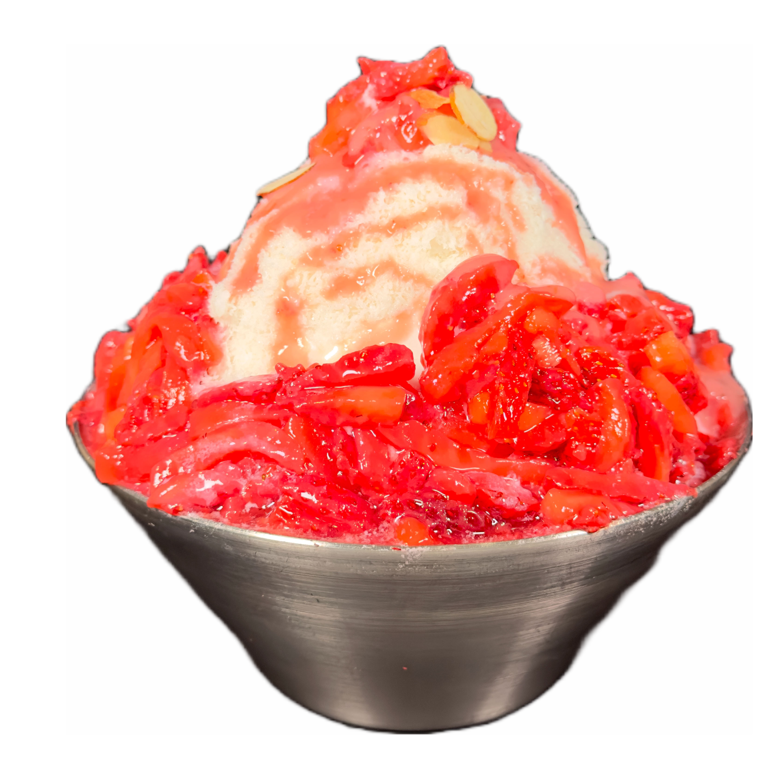 Creamy cheesecake bites and fresh strawberries. Topped with vanilla ice cream on sweet shaved ice.